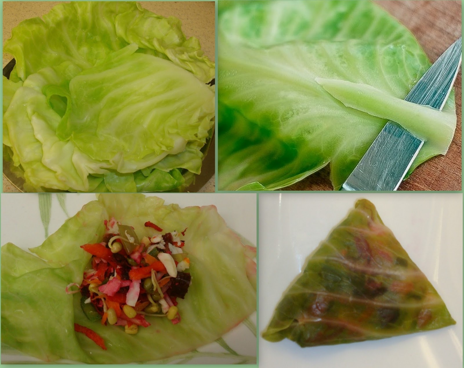 4.Place some of the salad mixer (about 1 1/2 tbsps) on each cabbage leaf and fold in sides. Fold the sides around the filling and try to fold in triangle shape so that it looks like Samosa. Secure with a toothpick or clove to have a nice, tight package. Place the Samosas on a plate and repeat with remaining leaves.