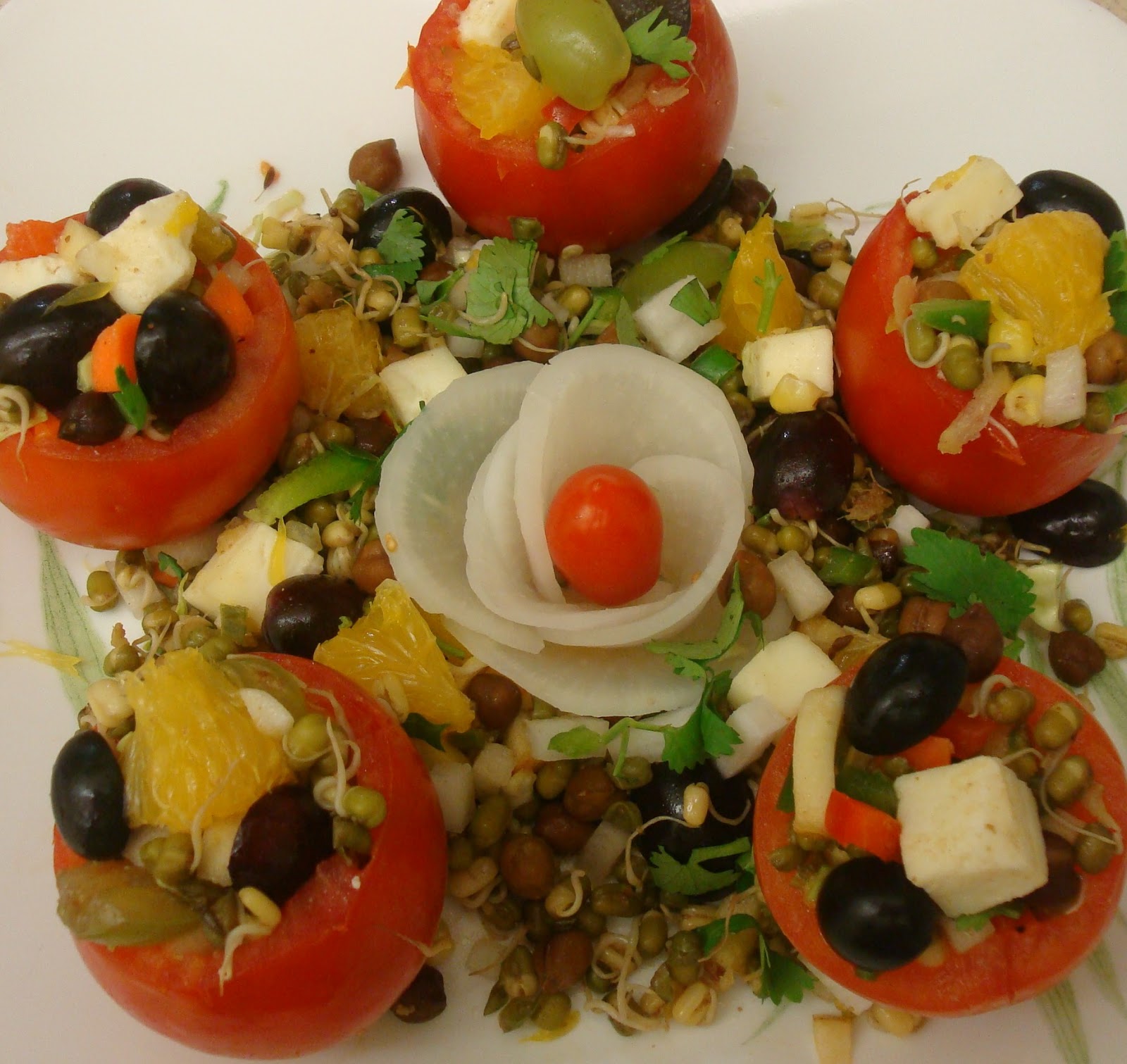 - In a medium bowl, combine all chopped vegetables and fruits and paneer into cooled mixer of sprouted moong and chana. Add dressing to the mixture and toss gently to coat.