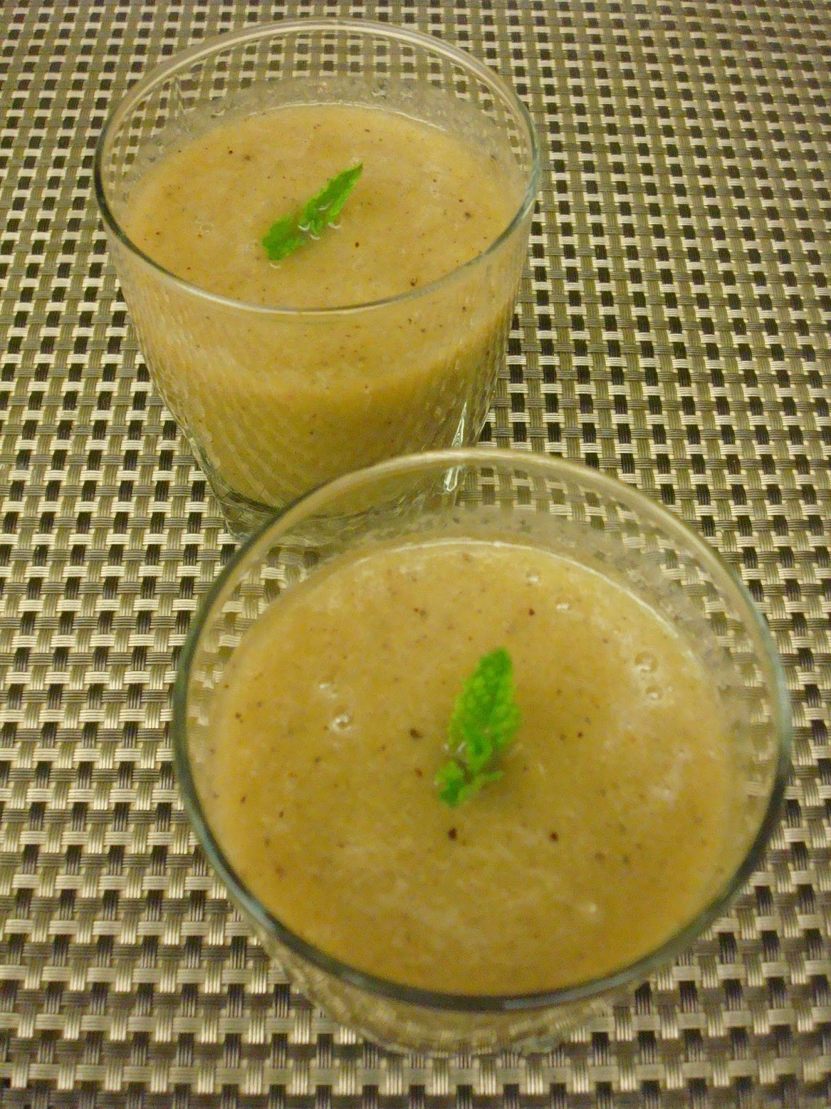 - Take apple, kiwi, grapes, mint leaves and ginger in blender. Add spiced water and Blend it till smooth.