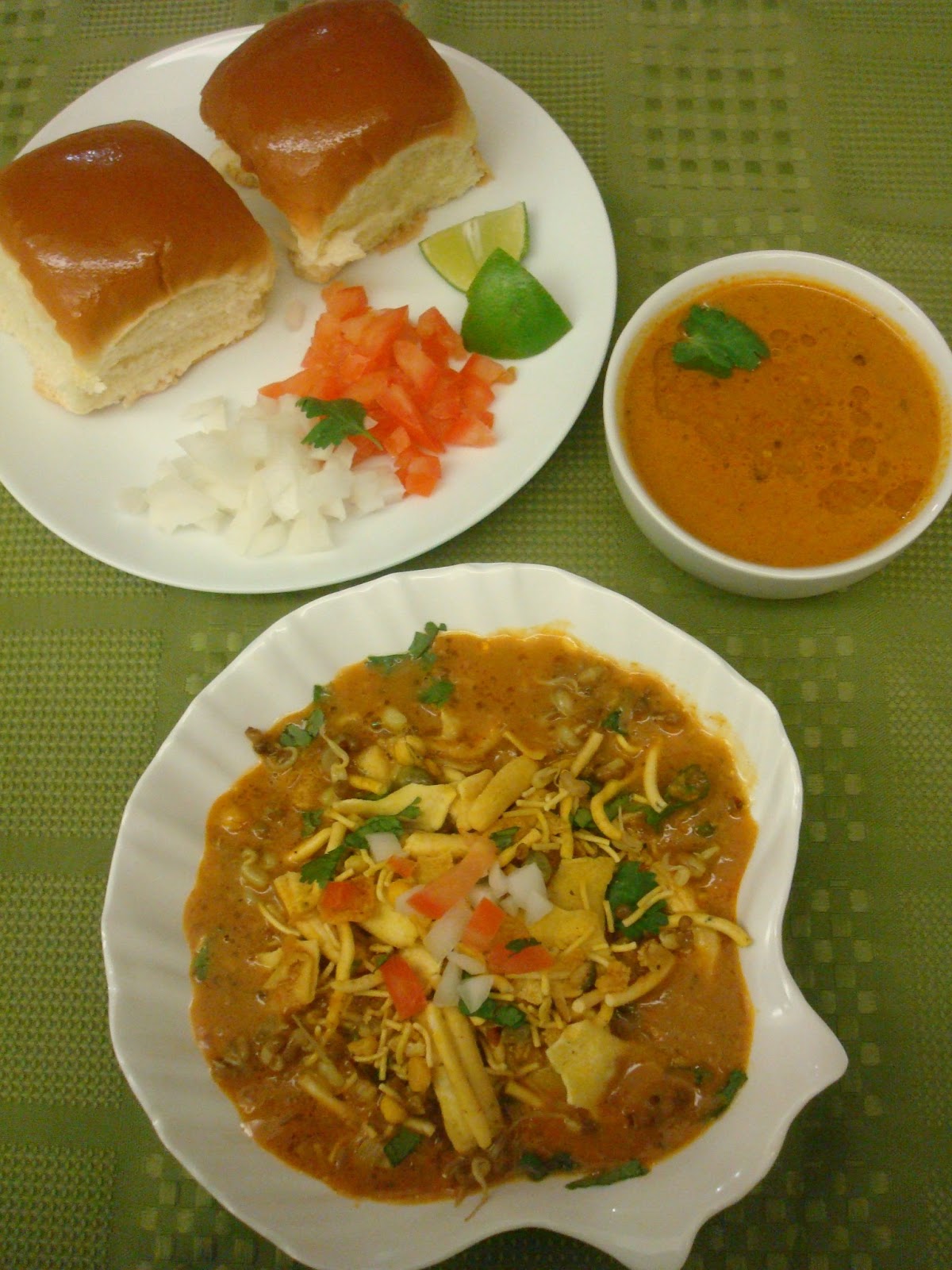 Matki Ussal which has less water content and a spicy and watery gravy / broth called Kutt with tarri (oil floats on curry). Usaually People mix these two according to their requirement and spicy taste, topped with Aaloo sabzi (stir fry potato), Farsan, chiwda, chopped onions and tomatoes. Pav (White bread buns) is a must. Also some people eat it with yogurt if they find it too spicy to their taste.
