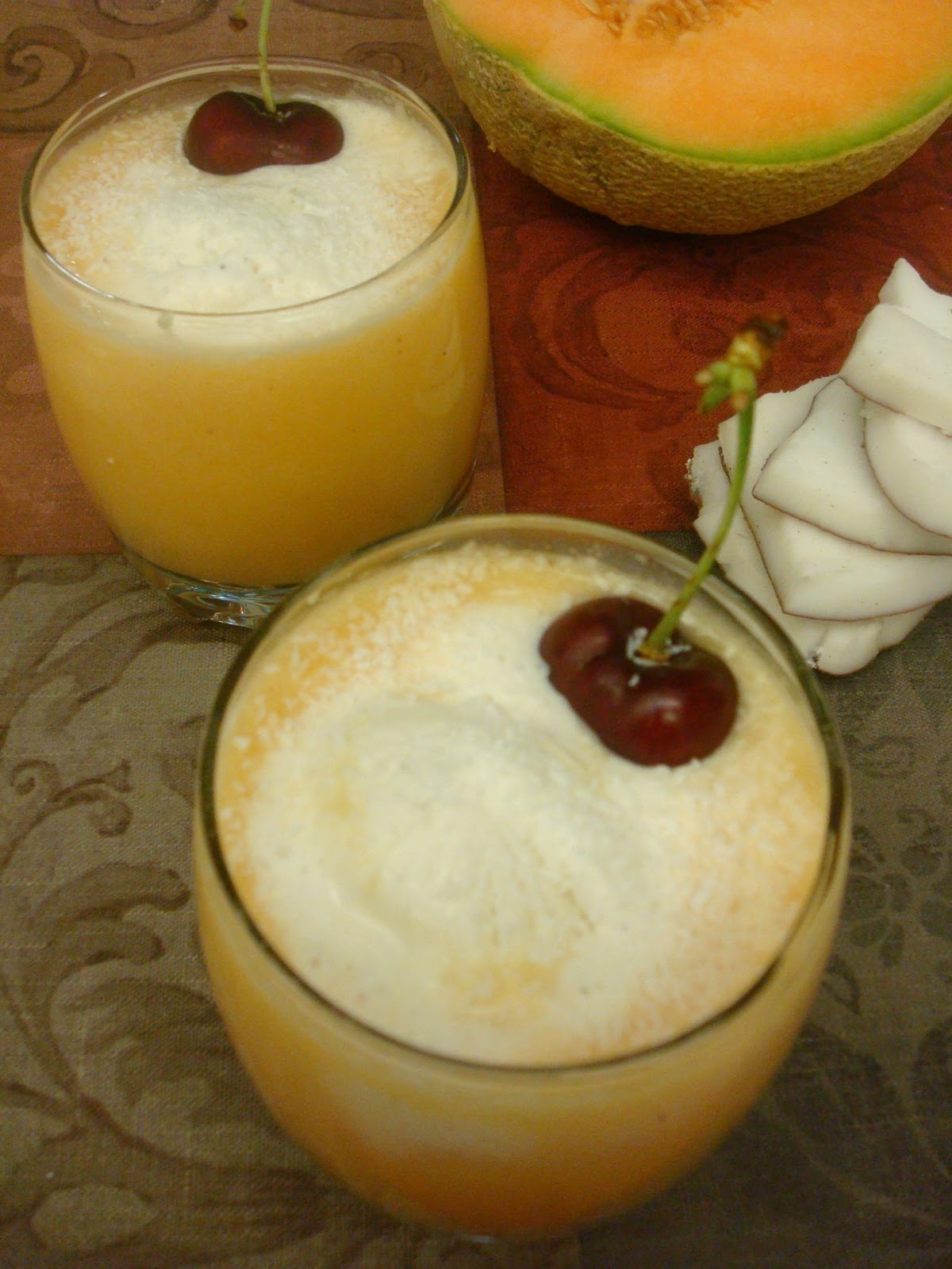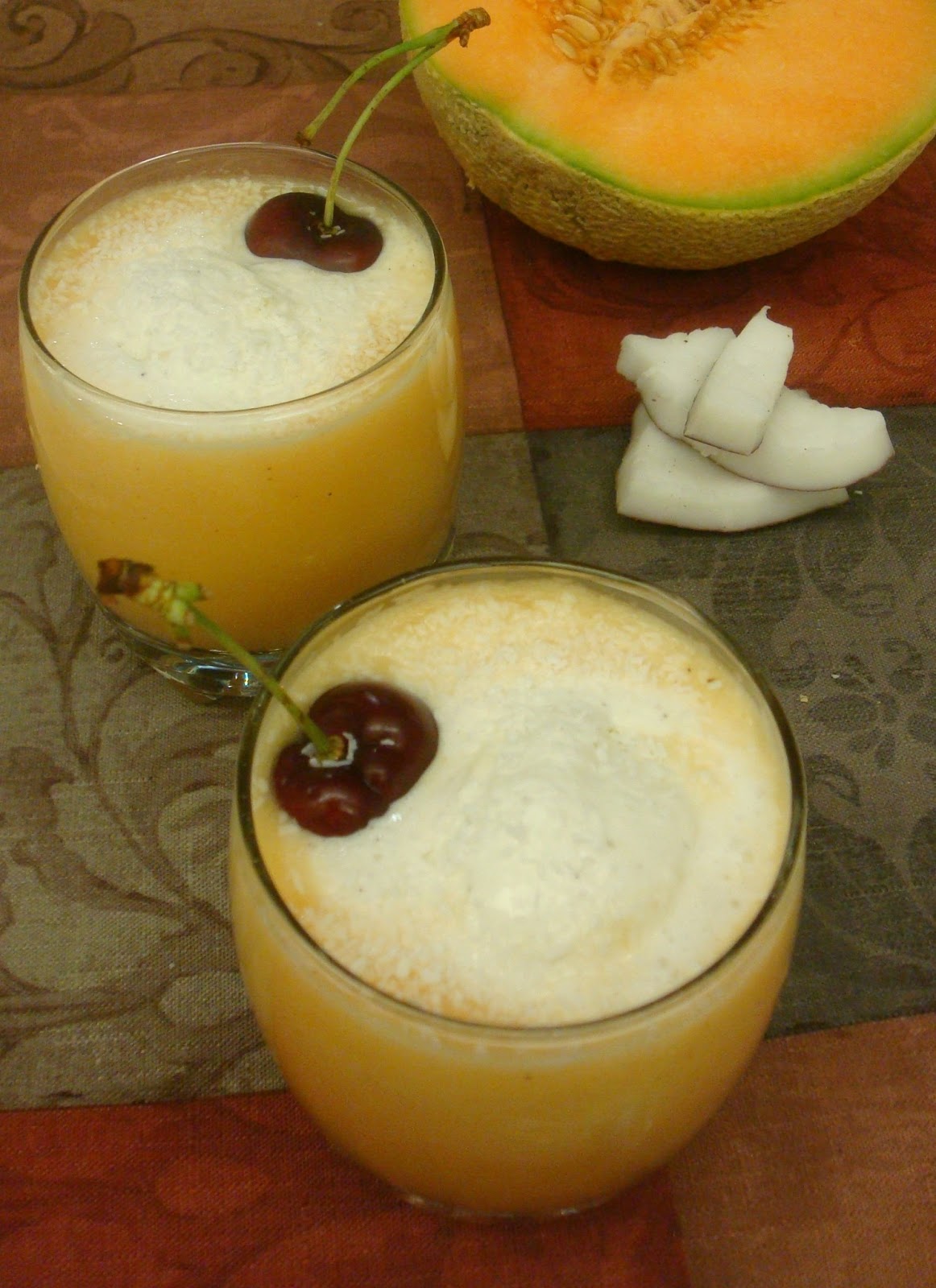 - Take the cantaloupe pieces, sugar, ice cubes and coconut milk into a blender and blend it till smooth.