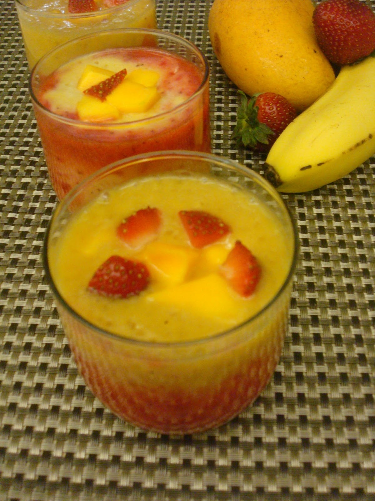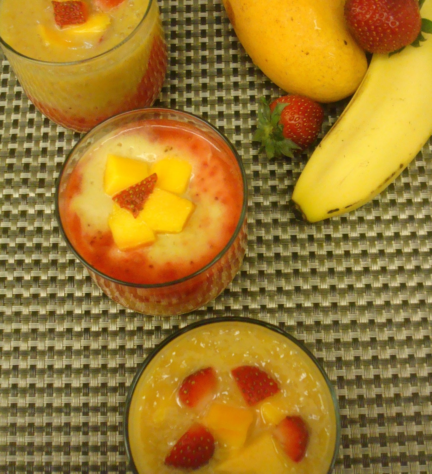 I used saffron which gives an elegant flavor to this lassi. In this recipe, first I blended strawberries with sugar and keep it aside. Then blended all the ingredients together till smooth. To serve, I poured 2-3 tablespoon of strawberry mixture into the glass and then added Mango-Banana mixture on top of strawberry mixture and garnished with few pieces of strawberry and mango.