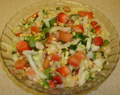 - Next add all chopped vegetables and fruits, into soaked moong dal and peanuts. And add salt, ground black pepper, lemon juice, ginger juice and Jeera(Cumin seed) powder and mix well.