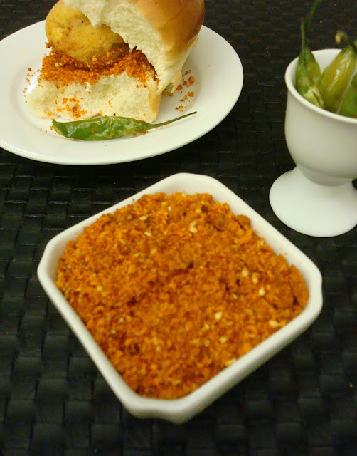 This is a popular Maharashtrian recipe and commonly known as vada pav chutney. However, it can be used as accompaniment along with several dishes. This chutney is made with a nice mix of roasted coconut flakes, sesame seeds, peanuts, garlic and chilies and spices. It gives spicy and nutty flavor.