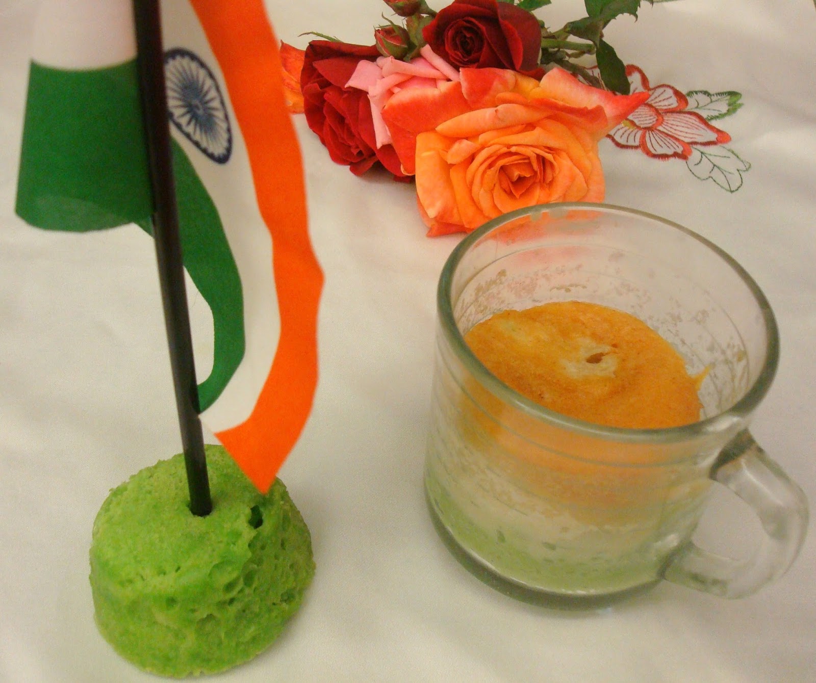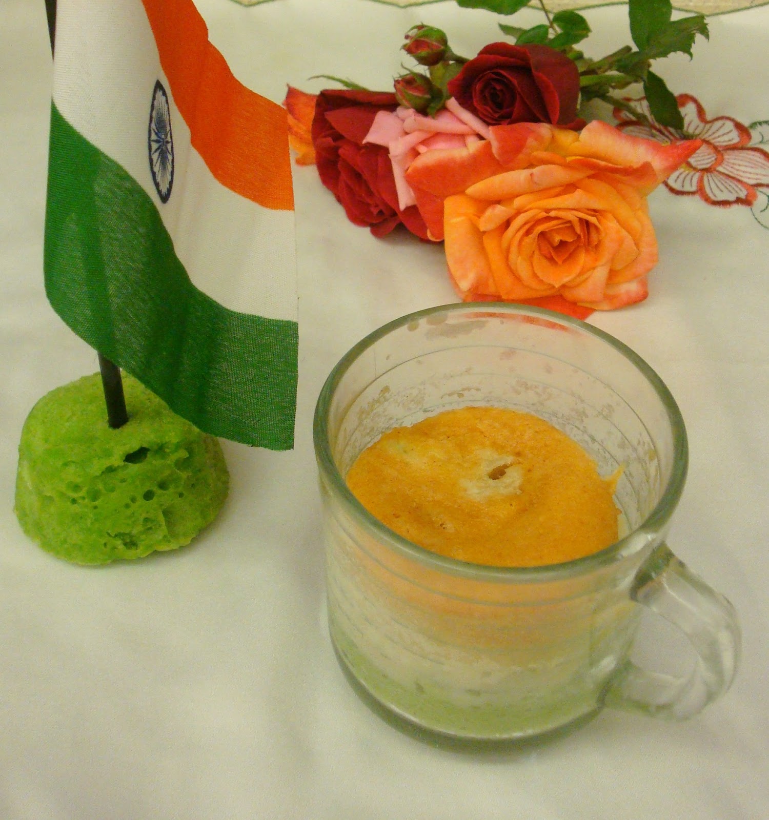 Today I just tried one-minute tri-color-Mug cake in a microwave and was successful. I used natural colors here for cake - carrots for saffron, milk for white and spinach for green..